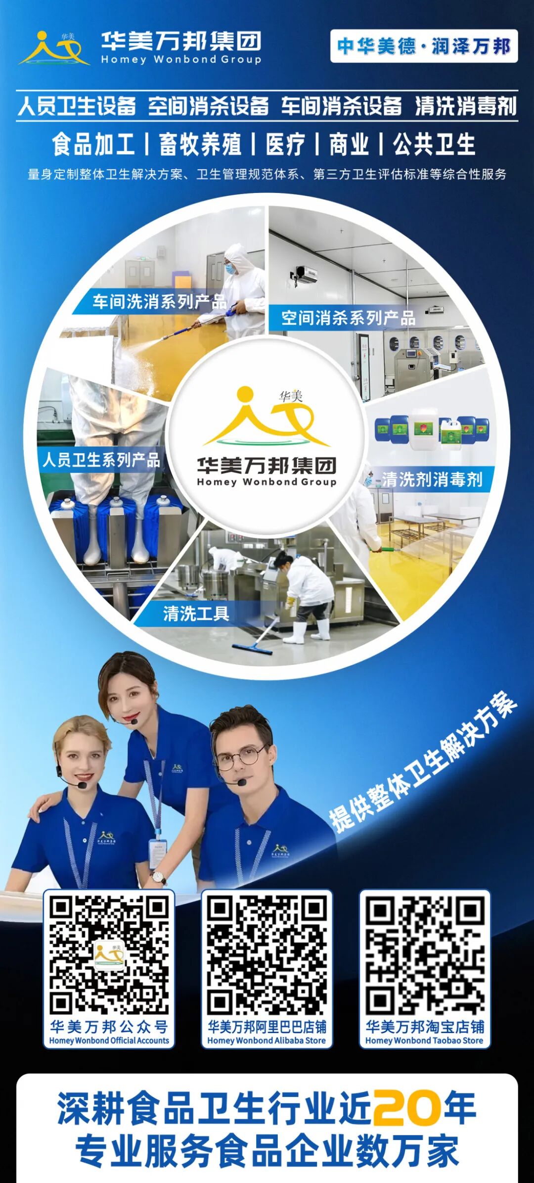 集团公司主要企业拥有环控生物技术研究院、华美万邦智能装备有限公司、清洗剂公司。集团为食品加工、畜牧养殖、医疗、商业、公共卫生等领域量身定制整体卫生解决方案、卫生管理规范体系、第三方卫生评估标准等综合性服务。协助企业提高卫生洗消标准,延长产品保质期,降低企业生产运营成本。