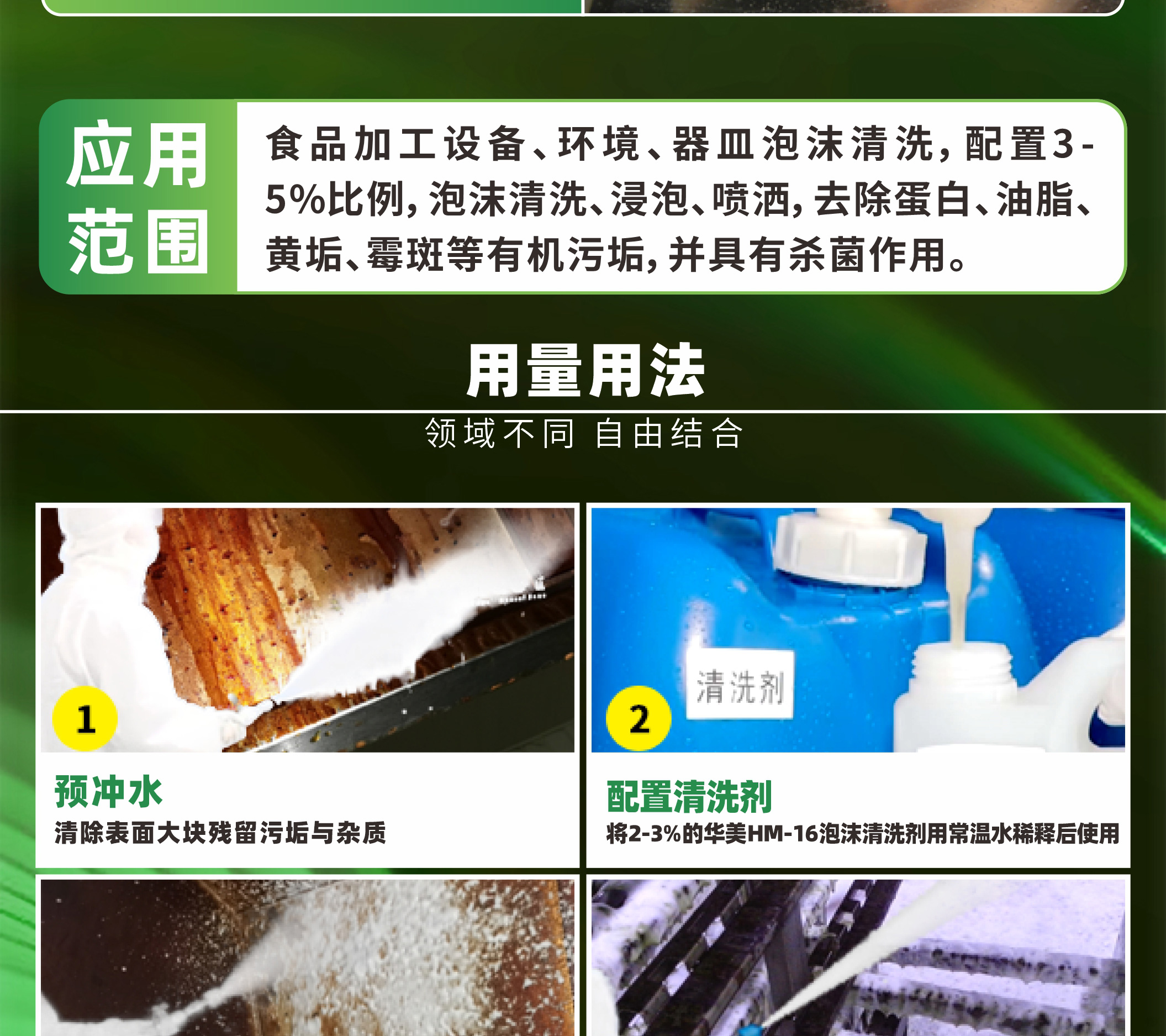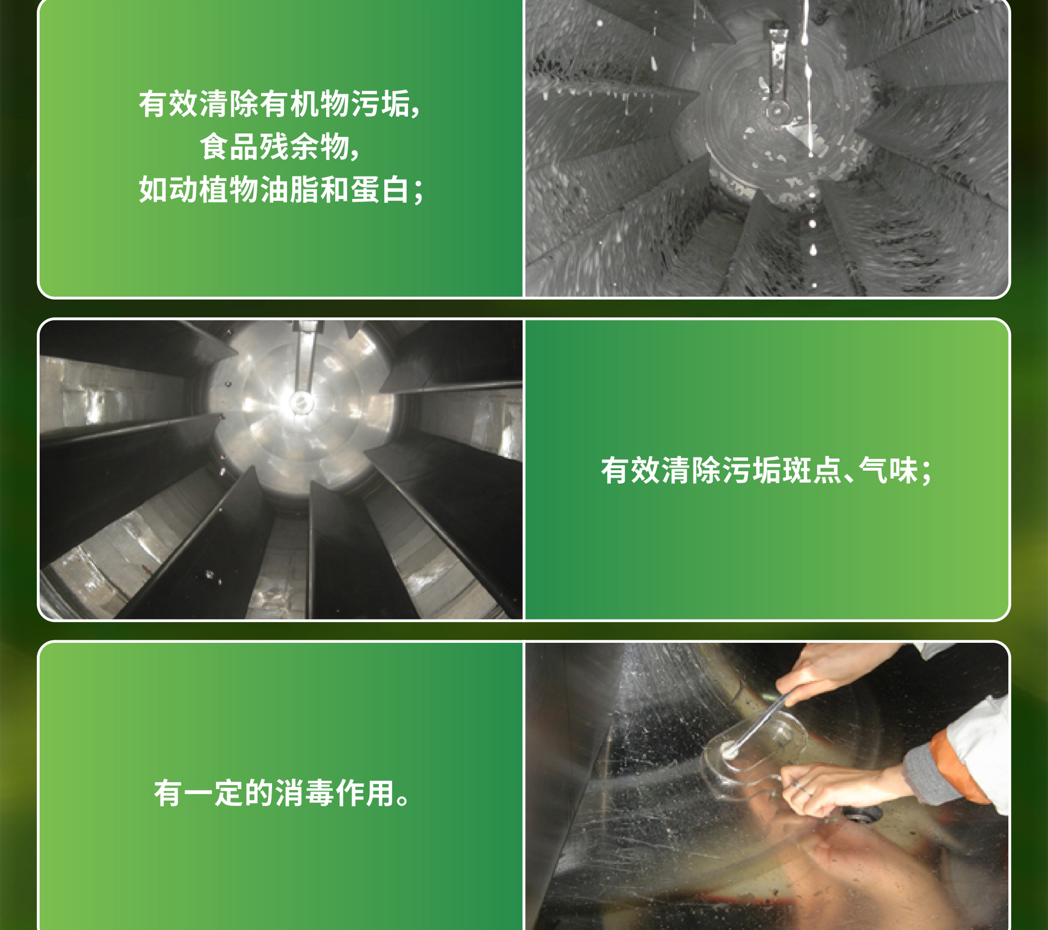 1. 有效清除有机物污垢,食品残余物,如动植物油脂和蛋白;